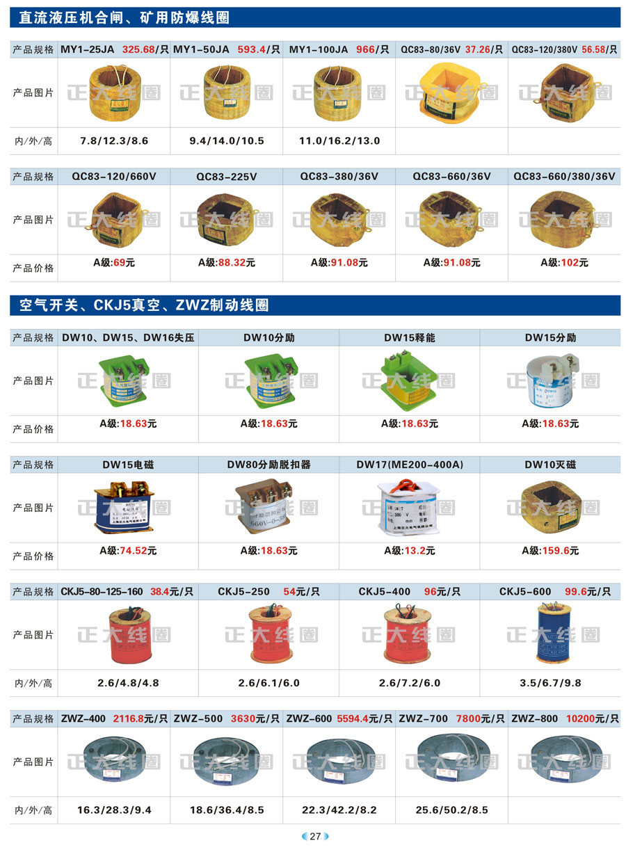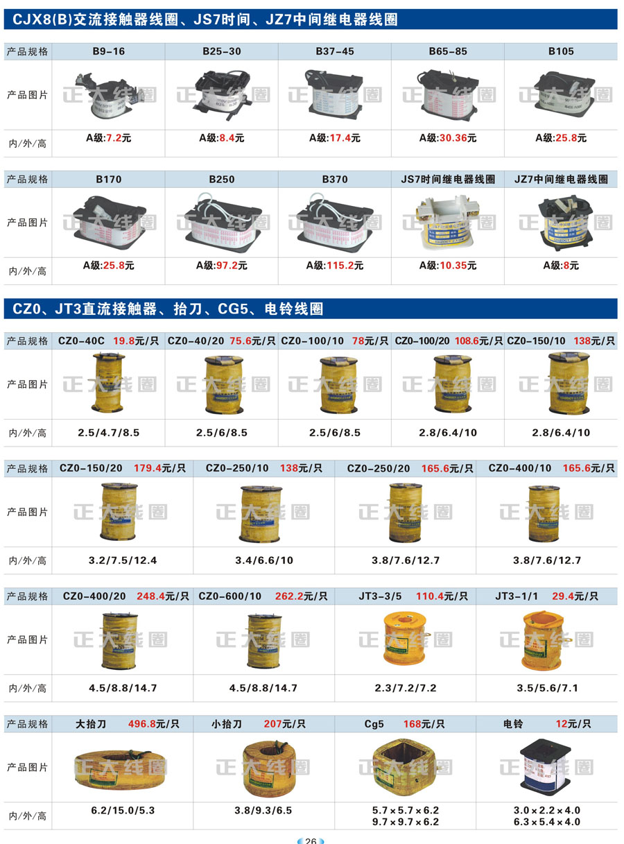 1.1 線圈作為頻繁接通和切斷電動機(jī)或其它負(fù)載主電路的切換電器,主要應(yīng)用于接觸器、繼電器、操作機(jī)構(gòu)、電磁鐵等開關(guān)。我公司現(xiàn)生產(chǎn)CJT1、CJ12、CJ20、CJ15、3TB、3TF、LC1、CKJ5、MZD1、MZS1、MQ1、MQ2、MFJ1、MZZ1、ZDZ1、YCT、DZ系列等線圈,目前是線圈同行業(yè)領(lǐng)先企業(yè)。